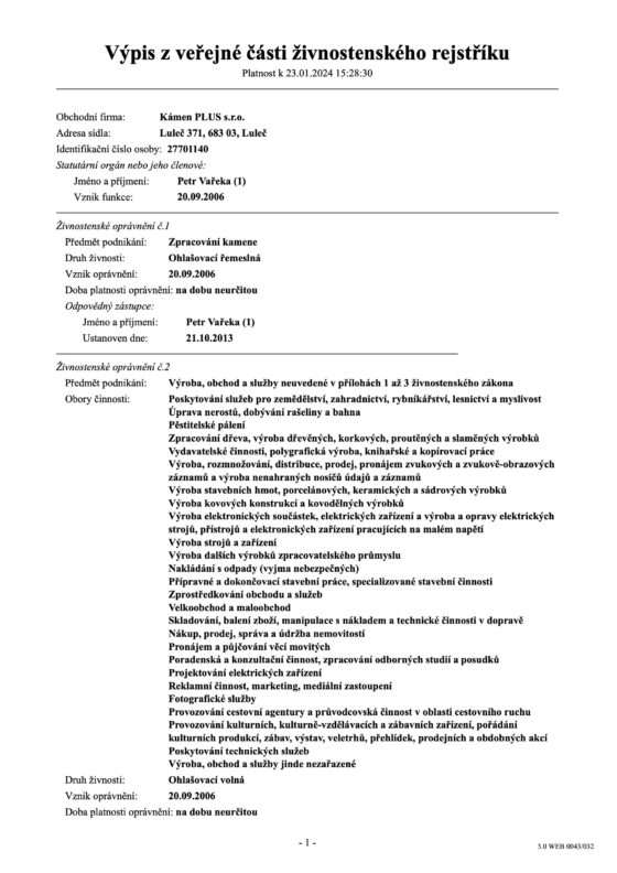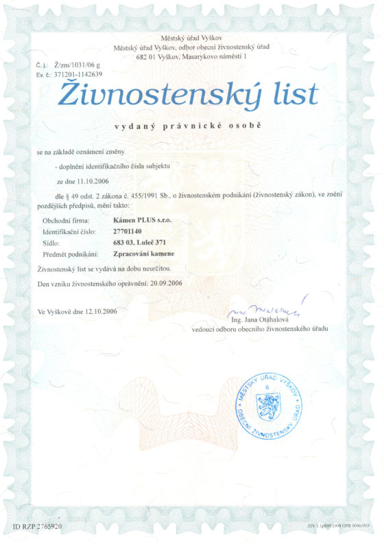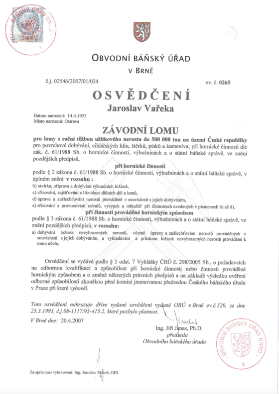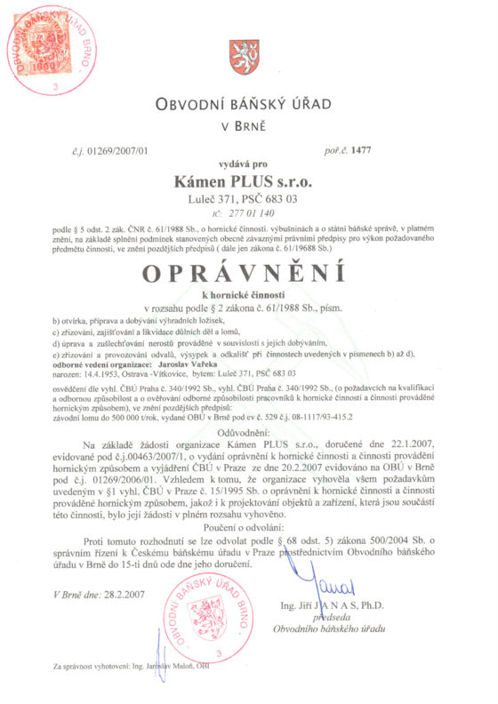 Ruční výběr kamene v kamenolomu a jeho prodej, včetně odborného poradenství našim zákazníkům, od nás vyžadují neustálé vzdělávání se a zlepšování svých znalostí. Během vývoje naší firmy jsme získali řadu různých certifikátů a oprávnění, které dokládají naši odbornost.