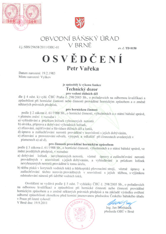 Osvědčení k výkonu funkce technický dozor pro vedení důlních děl, pro hornickou činnost